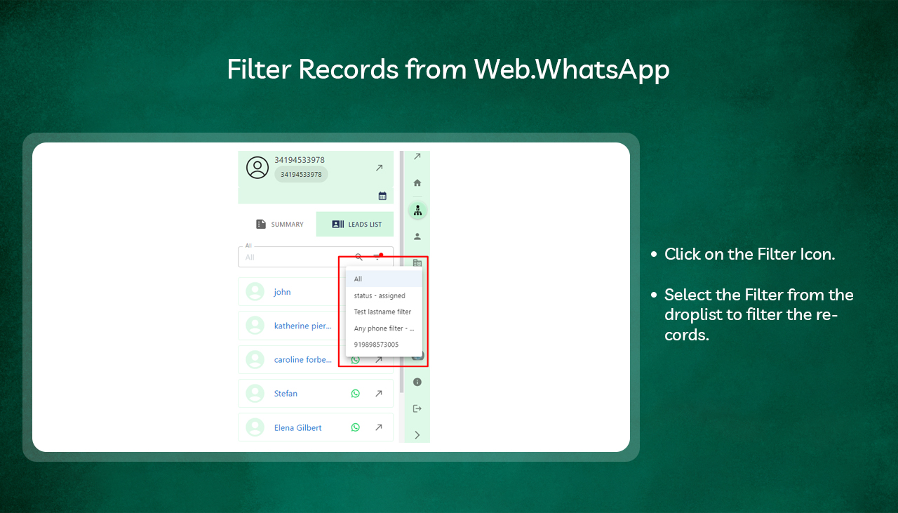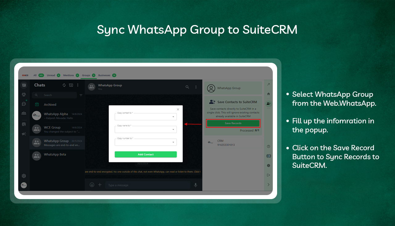 The WhatsApp Chrome Add-on for SuiteCRM streamlines your communication by connecting WhatsApp with your SuiteCRM leads, contacts, and accounts. It allows you to save records from WhatsApp into the CRM with a single click and automatically checks the status of associated records in the CRM. Tightly integrated with the Chrome browser, this add-on eliminates the need to open SuiteCRM separately, enabling you to update the CRM directly from your browser. This integration simplifies your workflow and enhances productivity by keeping all your communication tools in one place.